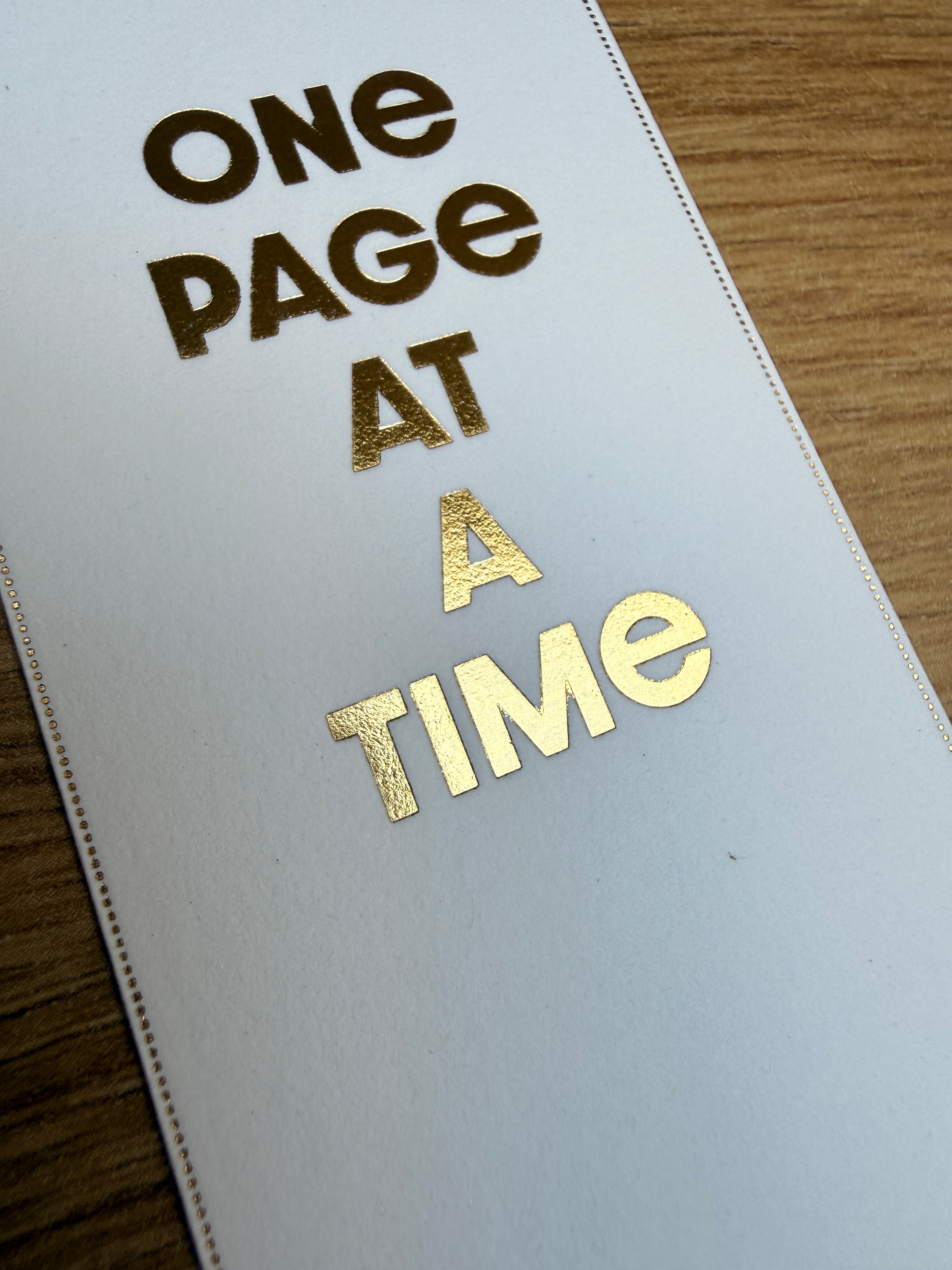 We have letterpressed some shiny foil of different colours into our 100% cotton board (300 gsm). Foiled are the words "one page at time" giving a gentle reminder to slow down. The edges have tiny dots of foil that glint like little jewels in the light. The soft board will respect your book, help you find your place with beauty and elegance.
